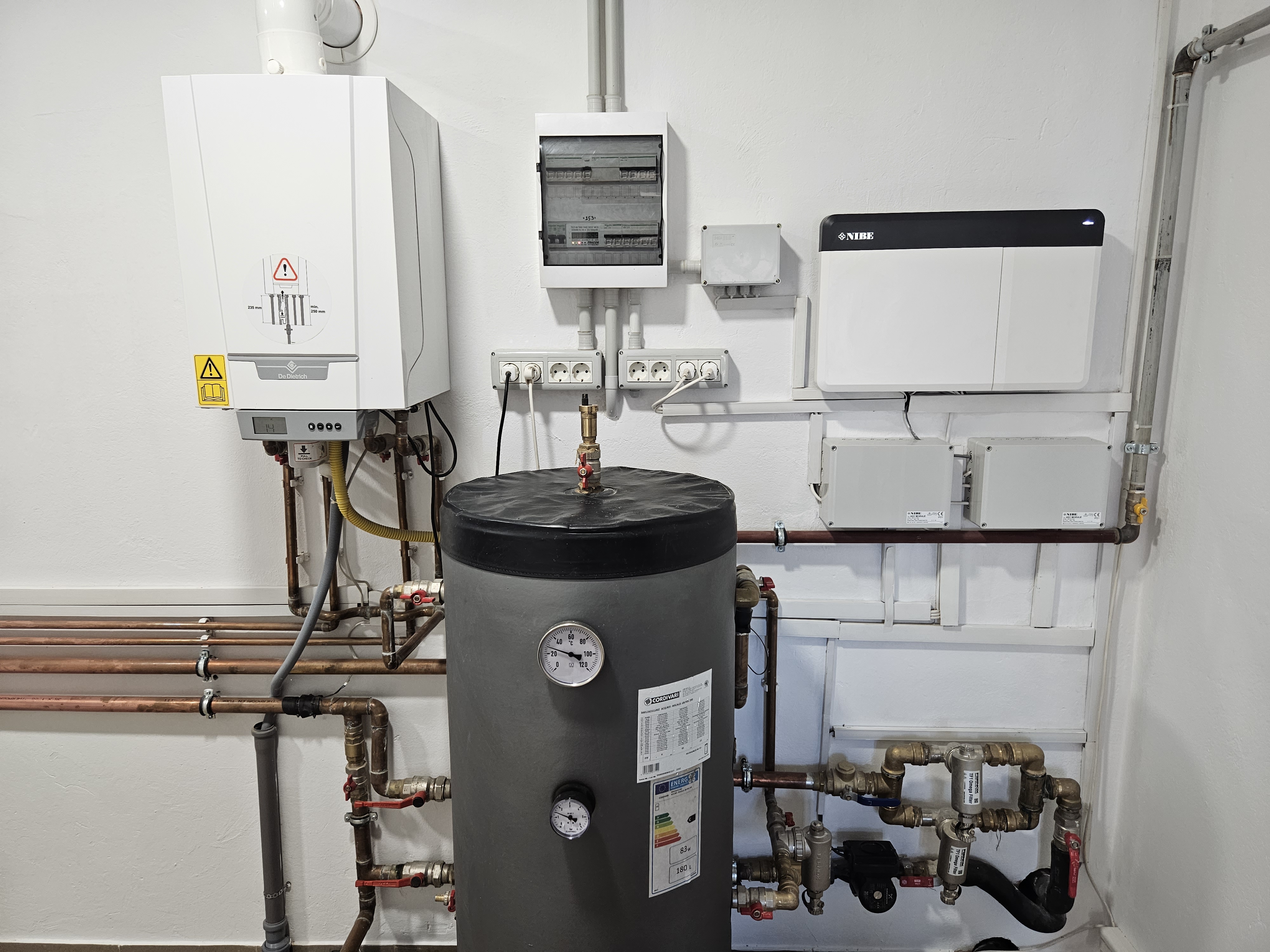 Instalație cu pompă de căldură NIBE F2120-20 + cazan DeDietrich Naneo S34 + un circuit încălzire nemixat + două circuite încălzire mixate + solar